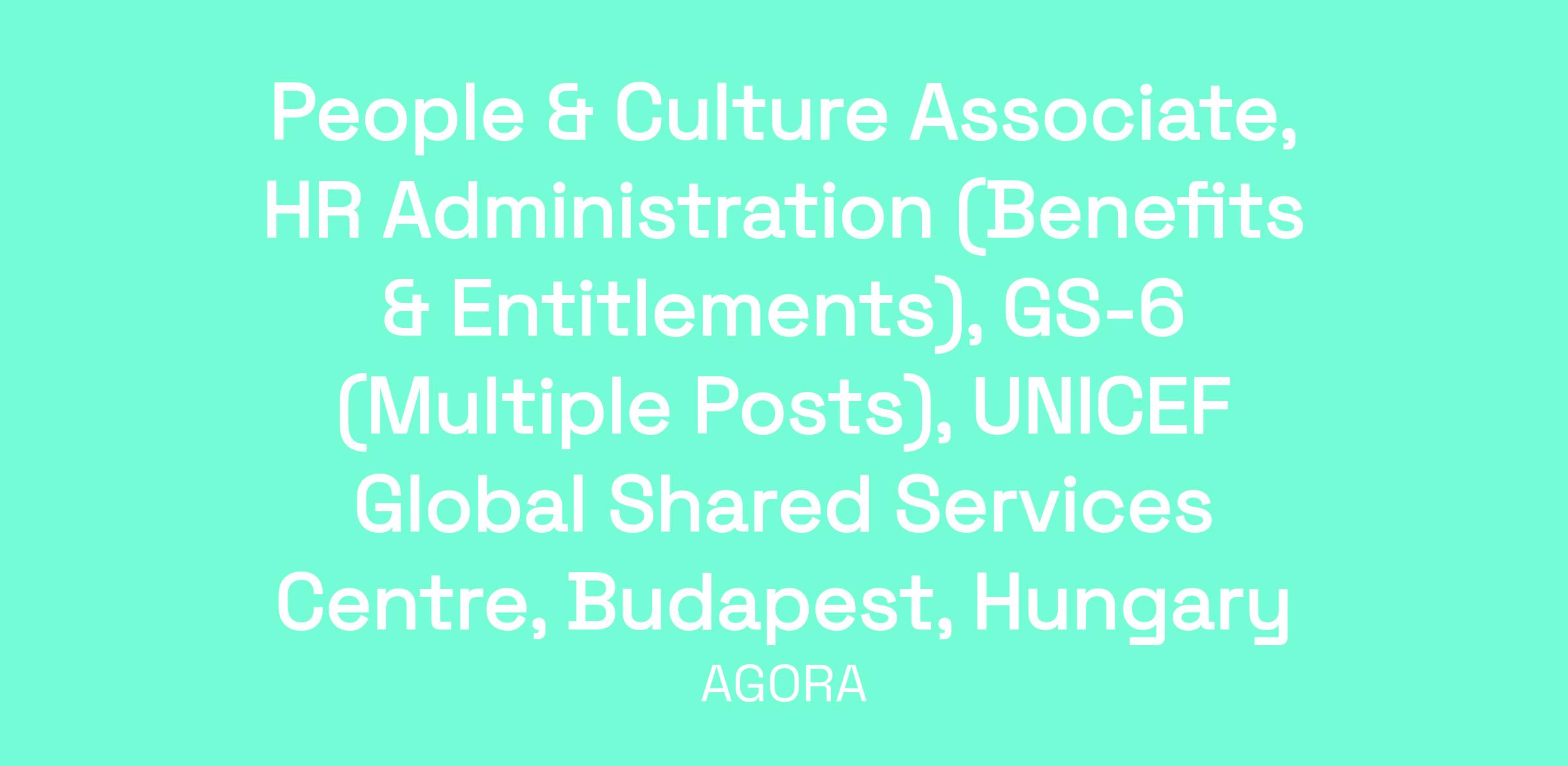 Under the direct supervision of the People & Culture Officer/Manager, the People & Culture Associate (Benefits & Entitlements), GS6 is responsible for the full range of activities for the personnel administration and benefits of staff in accordance with the UN Staff Rules and Regulations and UNICEF's policies and procedures.
