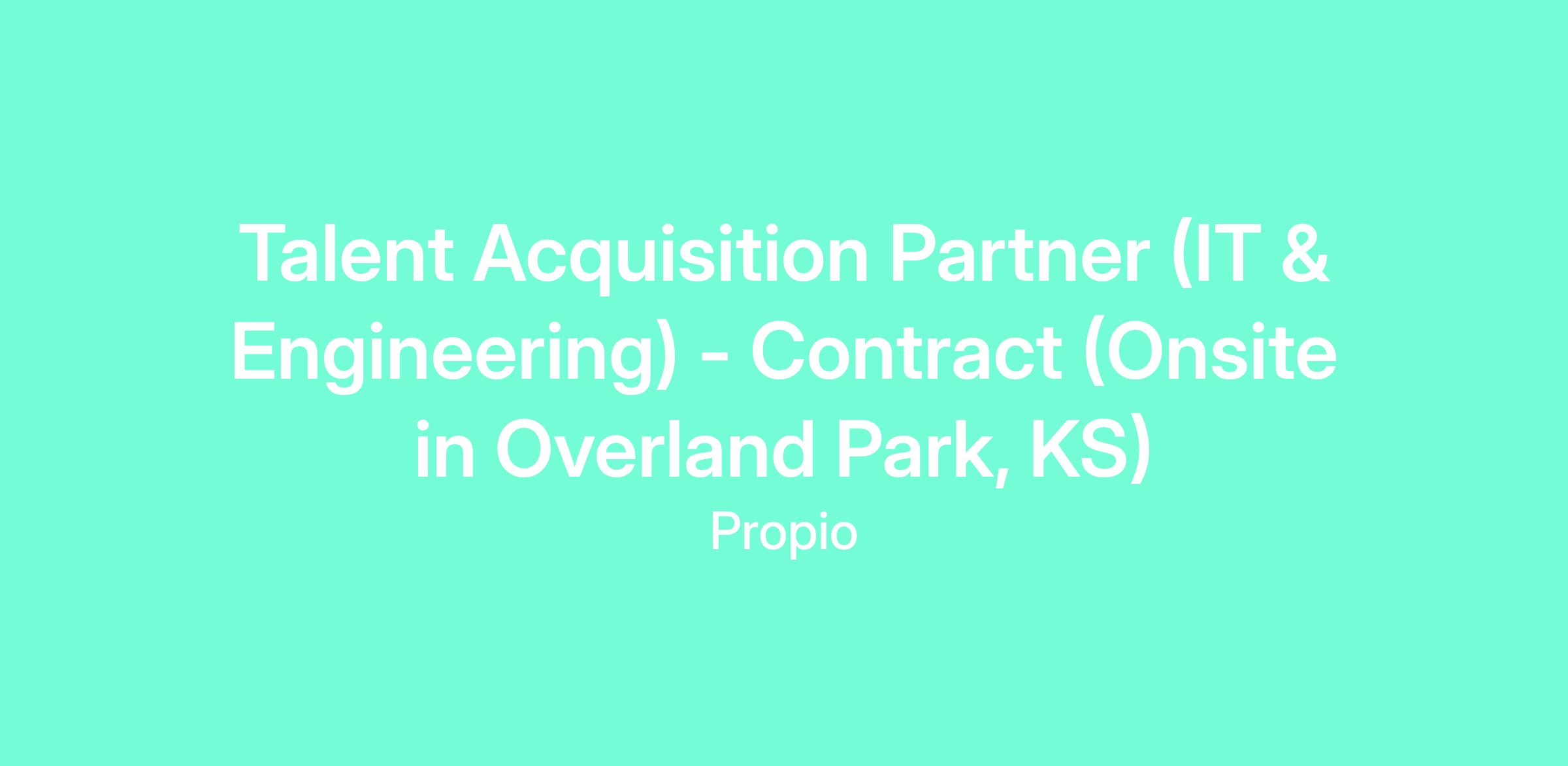 We are seeking a highly motivated and results-driven IT & Engineering-Focused Talent Acquisition Partner (Contract) to join our team onsite in Overland Park, KS. The Recruiter/Talent Acquisition Partner will be responsible for sourcing, screening, and selecting candidates to fill open positions within our organization. The ideal candidate will have a passion for talent acquisition, excellent communication skills, and a proactive approach to recruiting.